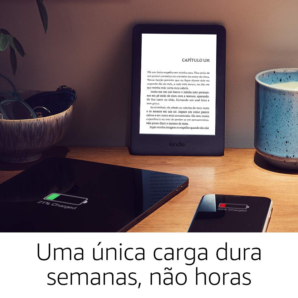 A bateria de um Kindle realmente dura semanas, variando de acordo com as configurações de uso, como modo avião e nível de brilho. Depois disso, só são necessárias algumas horas para recarregar totalmente de novo. Pode ter certeza que bateria é o que menos vai te preocupar em um Kindle.